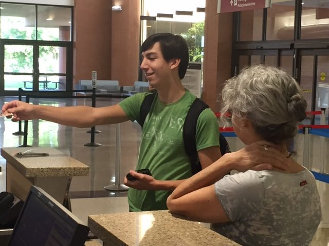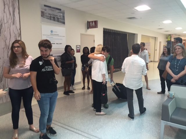 Camera follows The Boy through the security checkpoint. Cheers of farewell follow his progress. Even the TSA agents get in on the action.