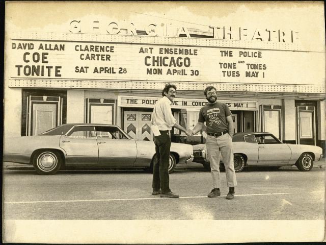 And thanks to Mitchell Feldman (left), the guy who made this show happen in a time and place where such a proposition – a Deep South presentation of Great Black Music – was decidedly unlikely. When Mitchell left Athens, I took over his Wednesday noontime jazz show at WUOG, Out to Lunch; this experience was probably the most valuable aspect of my undergraduate education. (Photo taken in front of the Georgia Theater the afternoon of the show.)